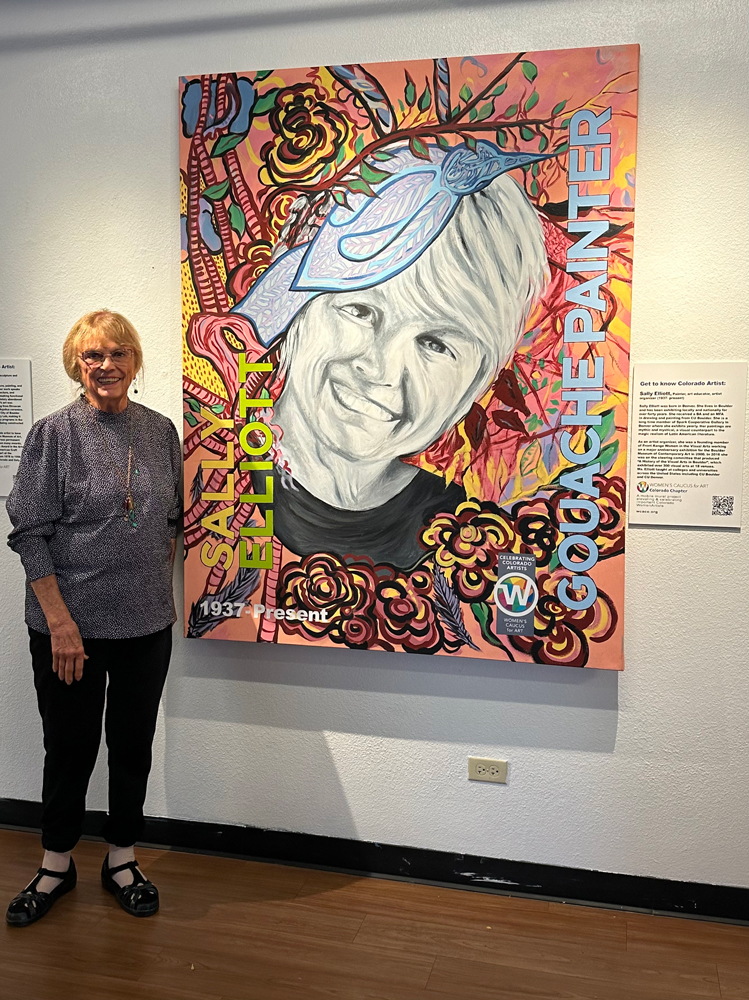 "Celebrating Colorado Women Artists," A mobile project celebrating important Colorado women artists done by members of the Denver Chapter of the Women's Caucus for Art. Sally Elliott with the painting they created to honor her.
